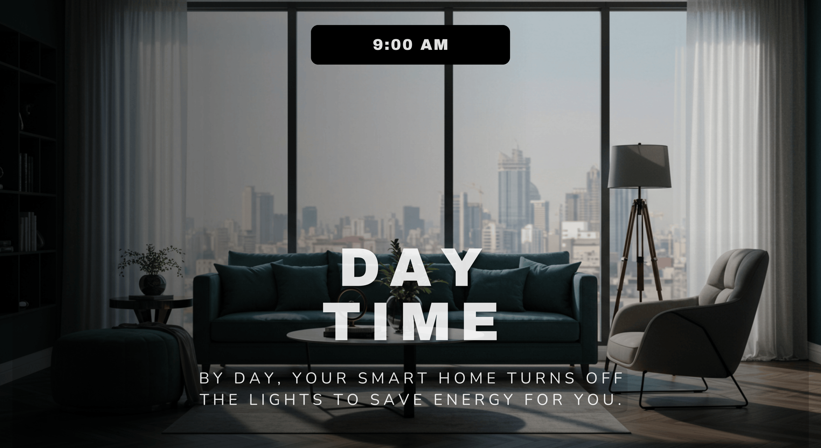 Lights adjust automatically based on presence detection and natural sunlight.